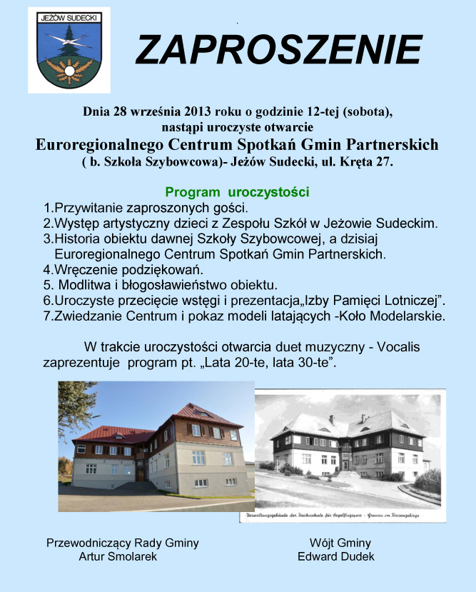 Zaproszenie na Górę Szybowcową Karkonosze Dnia 28 września 2013 roku o godzinie 12-tej (sobota), nastąpi uroczyste otwarcie Euroregionalnego Centrum Spotkań Gmin Partnerskich (b. Szkoła Szybowcowa)- Jeżów Sudecki, ul. Kręta 27