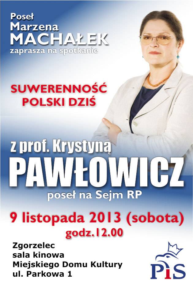 Poselskie spotkanie Karkonosze Zapraszamy na spotkanie z Posłanką prof. Krystyną Pawłowicz w Jeleniej Górze lub w Zgorzelcu na wykładzie „Suwerenność Polski dziś”. Wojciech Zembik