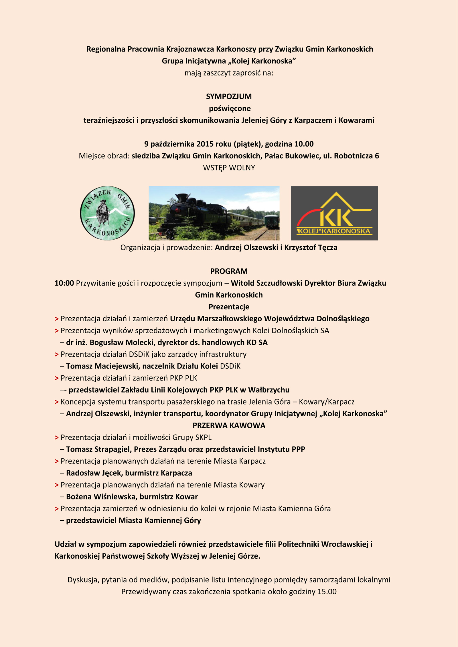 Regionalna Pracownia Krajoznawcza Karkonoszy przy Związku Gmin Karkonoskich oraz Grupa Inicjatywna „Kolej Karkonoska” zapraszają 9 października 2015 r. (piątek), godz. 10.00 na SYMPOZJUM poświęcone teraźniejszości i przyszłości skomunikowania Jeleniej Góry z Karpaczem i Kowarami.