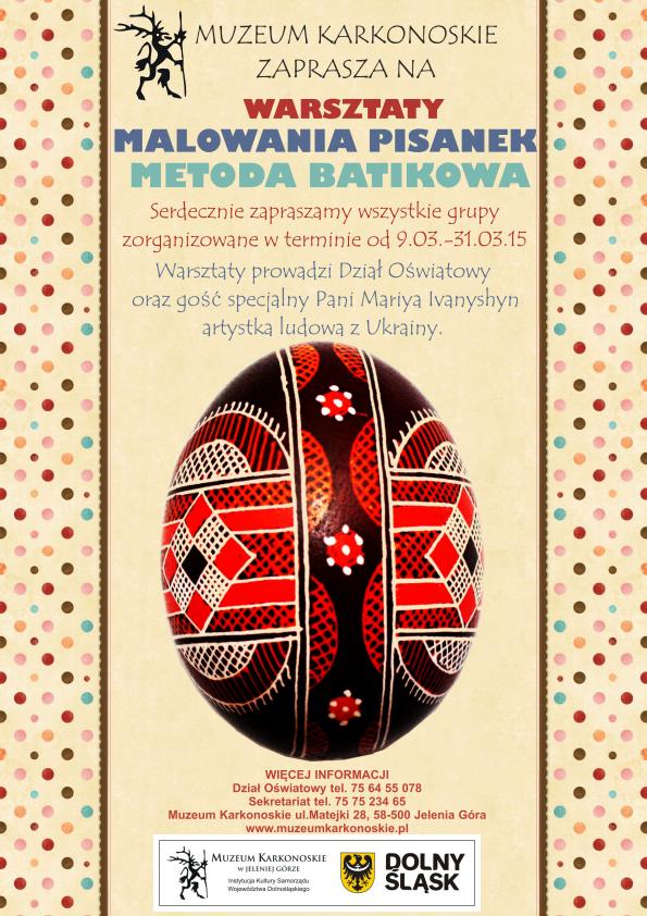 Muzeum Karkonoskie serdecznie zaprasza wszystkie grupy zorganizowane na warsztaty zdobienia pisanek w terminie od 9.03. do 31.03.15 Warsztaty prowadzi Dział Oświatowy oraz gość specjalny Pani Maria Ivaniszyn, artystka ludowa z Ukrainy.
