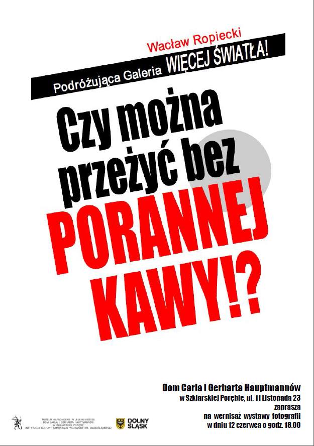 „Więcej światła” w Domu Hauptmannów Karkonosze W najbliższy piątek 12 czerwca 2015 r. zapraszamy do Domu Carla i Gerharta Hauptmannów w Szklarskiej Porębie na wernisaż fotografii Wacława Ropieckiego „Czy można przeżyć bez porannej kawy?” Szczegóły na plakacie.