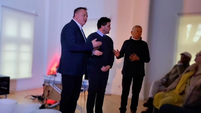 Jednym z elementów związanych z twórczością Bogusława Jasińskiego jest mała miejscowość nieopodal Kowar czyli Bukowiec. To właśnie tutaj znajduje się pałac, którego najbardziej znanymi właścicielami byli Fryderyk I Fryderyka von Reden. Dzisiaj jest on siedzibą Związku Gmin Karkonoskich. Ostatnio przeprowadzono tu prace remontowe podczas których odkryto schowane pod warstwą tynku stare malunki. Dlatego obiekt ten zaliczany jest obecnie do jednych z ładniejszych w naszym regionie. Nic też dziwnego, ze Bogusław Jasiński upodobał sobie ten właśnie obiekt postanawiając prezentować tu swoje spotkania. Ponieważ zarządzający pałacem dyrektor biura ZGK pan Łukasz Hada jest przychylny takim inicjatywom, a i zarząd ZGK nie ma nic przeciwko, powstała tu Galeria Sztuki Nowej ETHOS. I to właśnie w ramach niej 13 grudnia 2025 roku miał miejsce wernisaż wystawy „Oswoić wschód, wyzwolić ducha”. Ponieważ każda wystawa ma swoje ramy czasowe 14 lutego 2026 roku zorganizowano jej finisaż. To właśnie podczas tego wyjątkowego spotkania Bogusław Jasiński wcielił się w rolę kuratora oprowadzającego po wystawie. A trzeba przyznać, że bez jego opowieści, bez jego spojrzenia na przedstawiane dzieła nie do końca mogliśmy zrozumieć ten rodzaj sztuki. Ta bowiem przedstawiana na wystawie niejako odbiega od przyjętych standardów i niekoniecznie jest tak wyrazista jak jesteśmy do niej przyzwyczajeni.