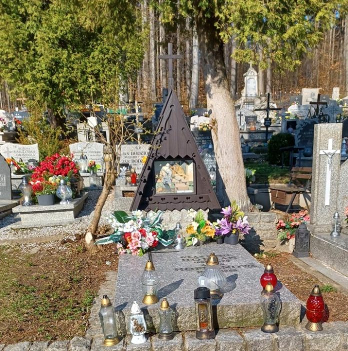 Pierwszym miejscem odwiedzonym przez nas był cmentarz parafialny. Jest to miejsce gdzie spoczywa wielu zasłużonych dla miasta osób. My zatrzymaliśmy się nad dwoma grobami. Najpierw wspominaliśmy Wlastimila Hofmana, artystę który zyskał miano „malarza wewnętrznego blasku”. Urodzony 27 kwietnia 1881 roku w Karlinie, obecnie dzielnicy Pragi, w rodzinie polsko-czeskiej, jako kilkuletnie dziecko osiadł w Krakowie. W jego karierze artystycznej pojawiali się kolejni nauczyciele ale największy wpływ na jego twórczość miał Jacek Malczewski.