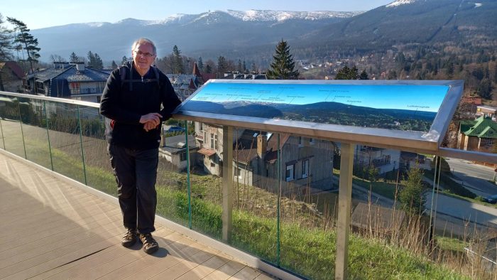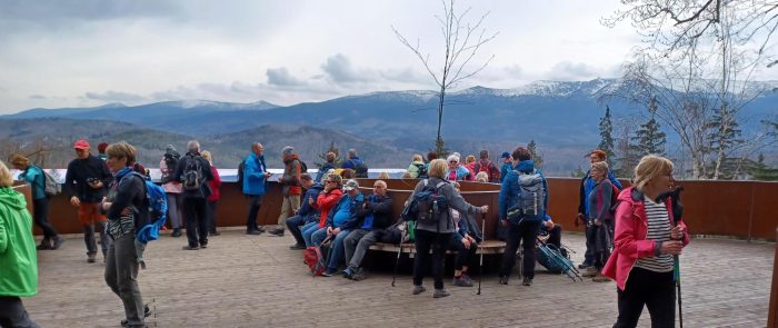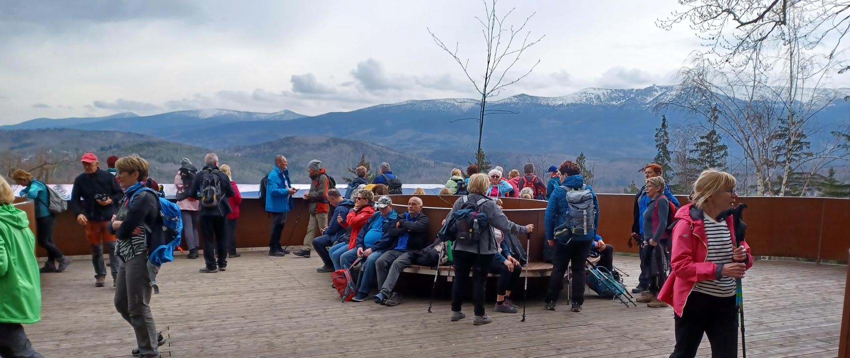 Już na miejscu zbiórki przed dworcem kolejowym turyści mogli podziwiać, korzystając z wybudowanej przez miasto platformy widokowej, piękne widoki na całe pasmo Karkonoszy. Powietrze było przejrzyste a więc widoki rewelacyjne.