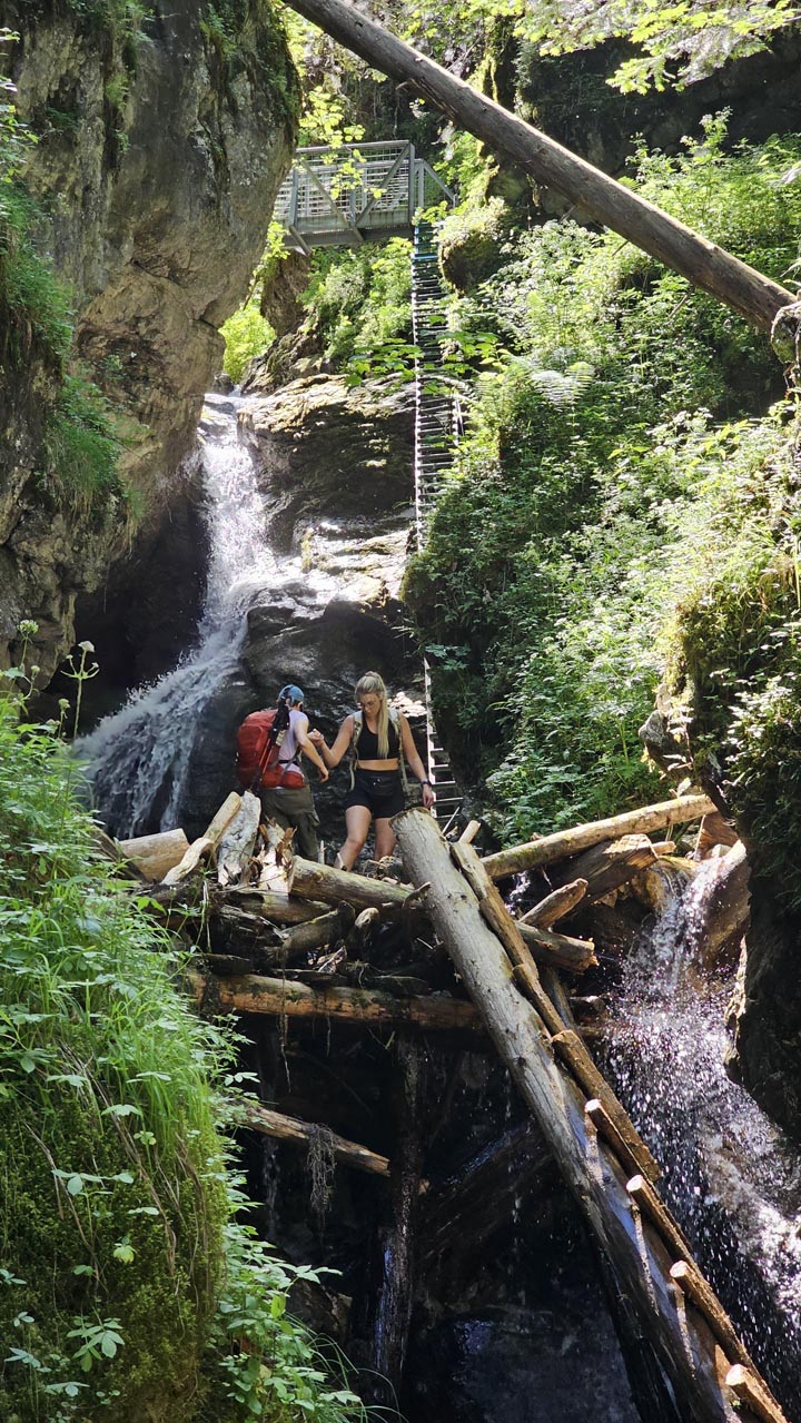 Wkrótce docieramy do miejsca zwanego Kamiennymi Wrotami (Kamenné vráta) z największym nagromadzeniem progów skalnych, wywierzysk, wodospadów i wąskich przejść. To tutaj zaczynają pojawiać się drabiny i kładki bez których nie przeszlibyśmy dalej. Ciekawostką jest to, że docierając pod Veľky vodopád mamy wrażenie iż poprzedni, Malý vodopád był większy. I wcale się nie pomylimy. Mały wodospad jest nim tylko z nazwy. Ma on bowiem 8 metrów wysokości. Aby go pokonać trzeba wspiąć się po metalowej drabinie a później przejść nad nim po mostku. Duży wodospad wbrew swojej nazwie jest o półtora metra niższy od poprzedniego. Tutaj jednak zanim dotrzemy do wąskiej drabiny musimy pokonać bardzo eksponowane stopnice. Na szczęście wsparciem są zamontowane solidne łańcuchy.