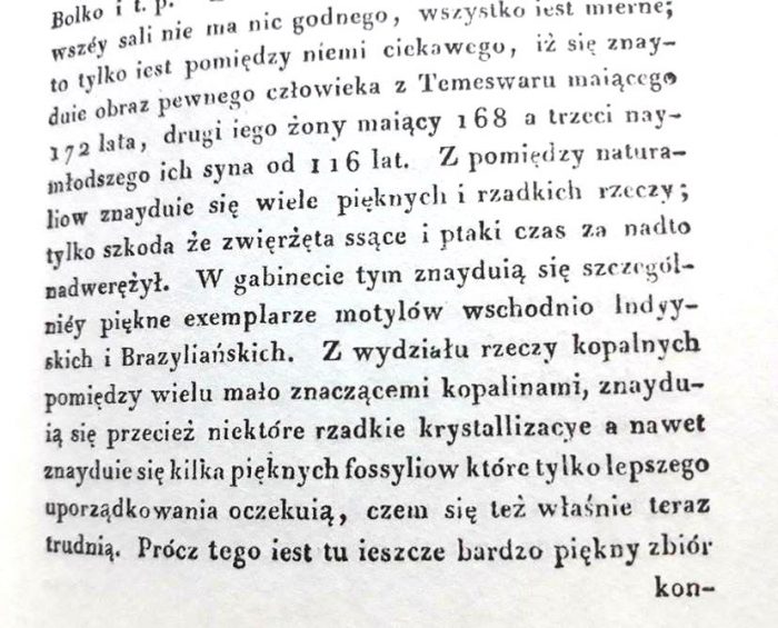 Poza biblioteką i kolekcją broni, autor opisał także kolekcję przyrodniczą. W oryginalnym tłumaczeniu brzmi to tak: Z pomiędzy naturaliow znayduie się wiele pięknych i rzadkich rzeczy; tylko szkoda że zwięrżęta ssące i ptaki czas za nadto nadwerężył. W gabinecie tym znayduia się szczególniéy piękne exemplarze motylów wschodnio lndyyskich i Brazyliańskich. Z wydziału rzeczy kopalnych pomiędzy wielu mało znaczącemi kopalinami, znayduią się przecież niektóre rzadkie krystallizacye a nawet znayduie się kilka pęknych fossyliow które tylko lepszego uporządkowania oczekuią, czem się też właśnie teraz trudnią. Jesteśmy zachwyceni!